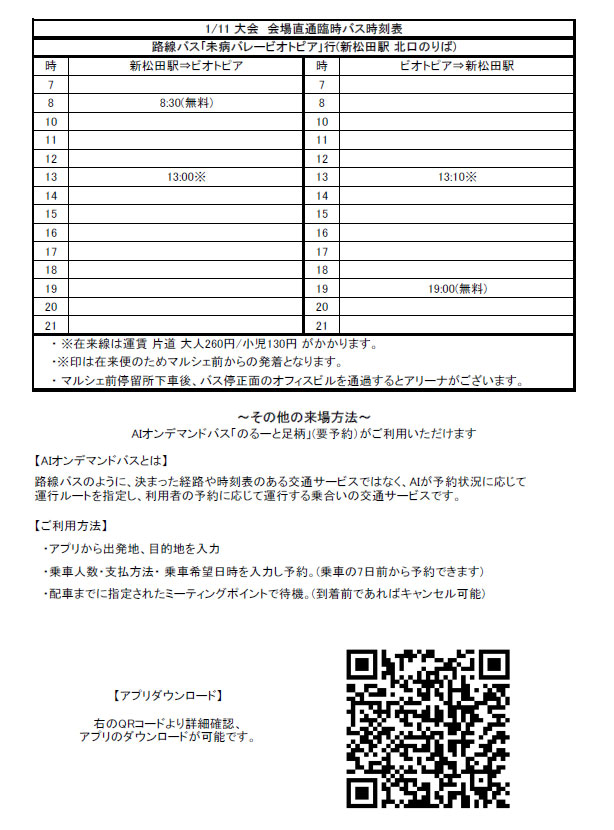 1月11日バス時刻表 2026年1月9日 最終更新日時 : 2026年1月9日 tmptstaff 会場(BIOTOPIA)は駐車場を無料でご利用いただけるためお車でのご来場がオススメではありますが、富士急バスさんのご協力により「新松田駅⇔試合会場BIOTOPIA」の直通バスをご用意していただきました。